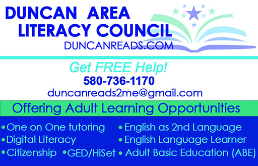 The mission of the Duncan Area Literacy Council is to promote literacy awareness and to provide free tutoring and basic literacy skills for all persons’ ages 15 and older, without regard to race, color, national origin, religion, sex, or disability; and to prepare them to lead more productive lives.